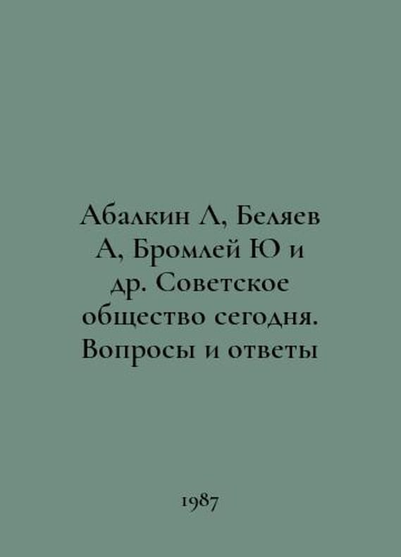 Abalkin L, Belyaev A, Bromley Yu et al. Soviet Society Today. Questions and Answers In Russian /Abalkin L, Belyaev A, Bromley Yu i dr. Sovetskoe obshchestvo segodnya. Voprosy i otvety M Politizdat 1987. You are welcome to reach out to us for a detailed description of the copies currently available. Delivery of this book may take longer than usual including extended processing and pre-shipping time, no expedited shipping is available. Please advise us if you have a set date or a deadline to receive your order.SKUalba16f69a04255e69b