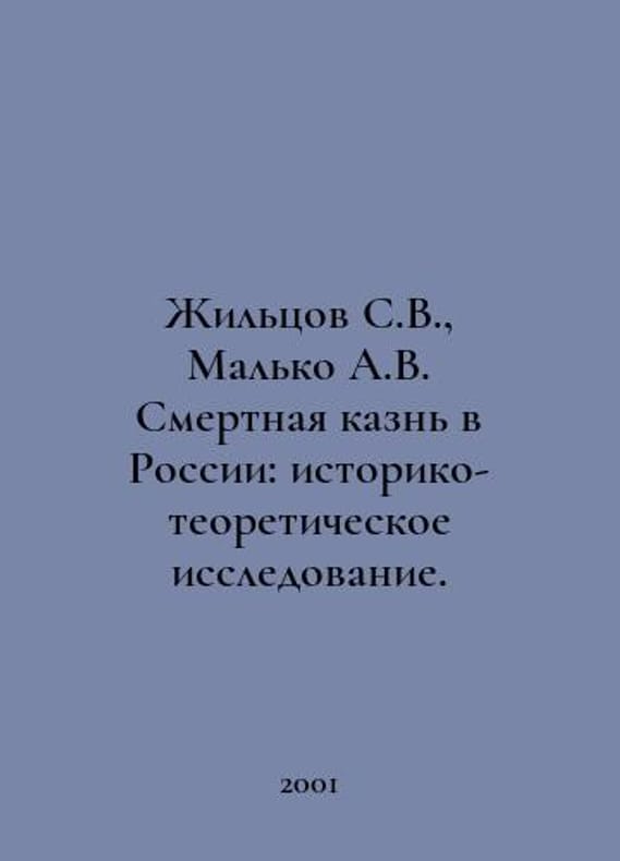 Zhiltsov S.V., Malko A.V. The Death Penalty in Russia: Historical and Theoretical Research. In Russian /Zhiltsov S.V., Malko A.V. Smertnaya kazn v Rossii: istoriko-teoreticheskoe issledovanie. Togliatti-Samara Volga State University named after V. N. Tatishchev 2001.You are welcome to reach out to us for a detailed description of the copies currently available. SKUalba48dfa3c51b46b56.