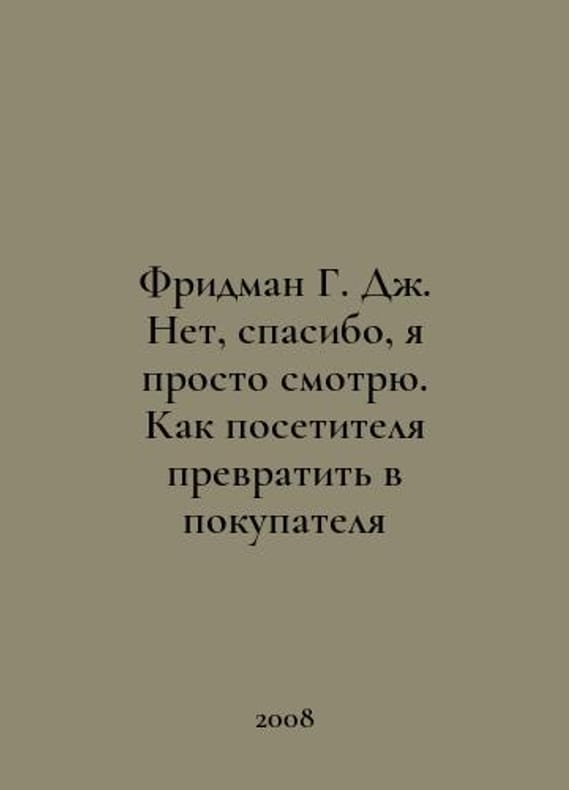 Friedman G. J. No, thank you, Im just watching. How to turn a visitor into a buyer In Russian /Fridman G. Dzh. Net, spasibo, ya prosto smotryu. Kak posetitelya prevratit v pokupatelya Olympus Business 2008.You are welcome to reach out to us for a detailed description of the copies currently available. SKUalba7f62aabe604c421.