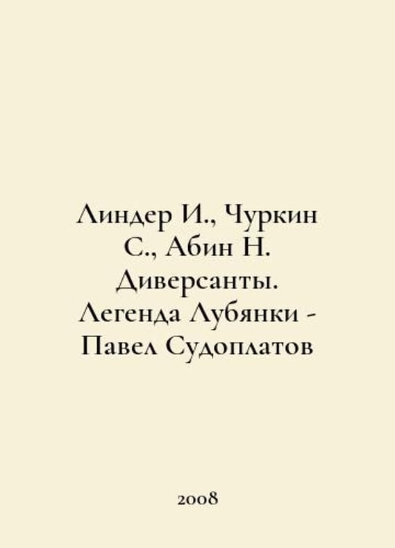 Linder I., Churkin S., Abin N. Saboteurs. The Legend of Lubyanka - Pavel Sudoplatov In Russian /Linder I., Churkin S., Abin N. Diversanty. Legenda Lubyanki - Pavel Sudoplatov M. Ripoll 2008. You are welcome to reach out to us for a detailed description of the copies currently available. Delivery of this book may take longer than usual including extended processing and pre-shipping time, no expedited shipping is available. Please advise us if you have a set date or a deadline to receive your order.SKUalba9046c045f1dd882