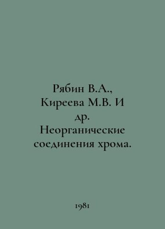 Ryabin V.A., Kireeva M.V. et al. Inorganic compounds of chromium. In Russian /Ryabin V.A., Kireeva M.V. I dr. Neorganicheskie soedineniya khroma. Leningrad Khimiya. 1981..You are welcome to reach out to us for a detailed description of the copies currently available. Delivery of this book may take longer than usual including extended processing and pre-shipping time, no expedited shipping is available. Please advise us if you have a set date or a deadline to receive your order. SKUalba976037d4efb4ed0