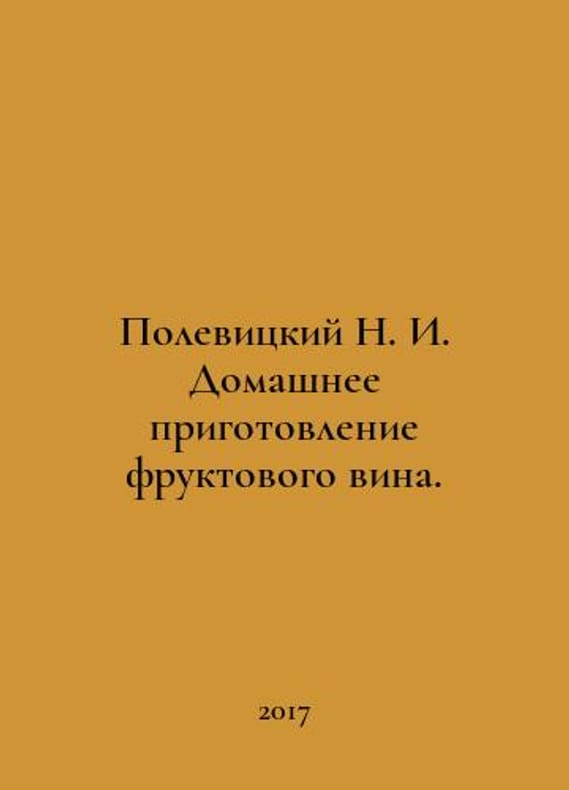 Polevitsky N. I. Home preparation of fruit wine. In Russian /Polevitskiy N. I. Domashnee prigotovlenie fruktovogo vina. Moscow Publishing House V. Sekachev 2017. You are welcome to reach out to us for a detailed description of the copies currently available. Delivery of this book may take longer than usual including extended processing and pre-shipping time, no expedited shipping is available. Please advise us if you have a set date or a deadline to receive your order.SKUalba9b9e34a967b7a8e