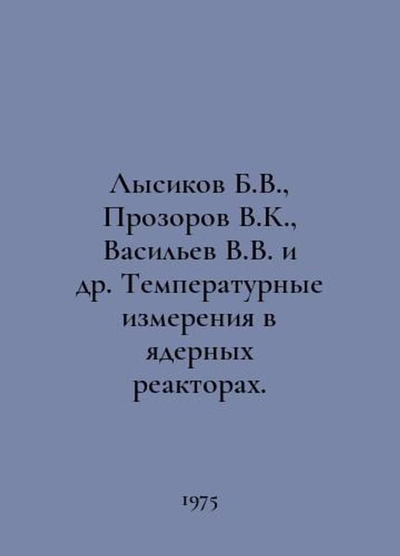 Lysikov B.V., Prozorov V.K., Vasiliev V.V. et al. Temperature measurements in nuclear reactors. In Russian /Lysikov B.V., Prozorov V.K., Vasilev V.V. i dr. Temperaturnye izmereniya v yadernykh reaktorakh. M. Atomizdat 1975.You are welcome to reach out to us for a detailed description of the copies currently available. SKUalba9e880a362fabb35.