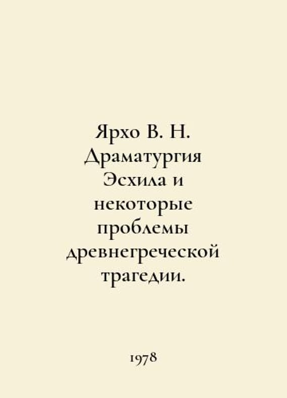 Yarkho V.N. Aeschyluss Drama and Some Problems of Ancient Greek Tragedy. In Russian /Yarkho V. N. Dramaturgiya Eskhila i nekotorye problemy drevnegrecheskoy tragedii. M. Art Literature. 1978. You are welcome to reach out to us for a detailed description of the copies currently available. Delivery of this book may take longer than usual including extended processing and pre-shipping time, no expedited shipping is available. Please advise us if you have a set date or a deadline to receive your order.SKUalbaf99fc01e91731c8