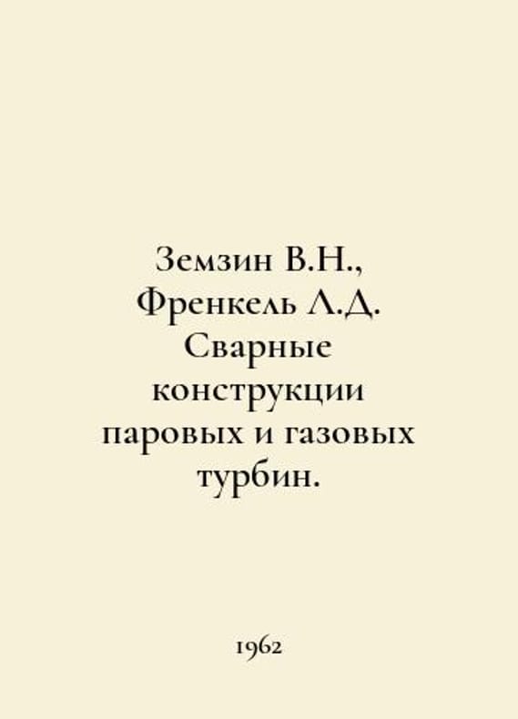 Zemzin V.N., Frenkel L.D. Welded designs of steam and gas turbines. In Russian /Zemzin V.N., Frenkel L.D. Svarnye konstruktsii parovykh i gazovykh turbin. M., L. Mashgiz 1962.You are welcome to reach out to us for a detailed description of the copies currently available. SKUalbb07c46f65abddcbf.