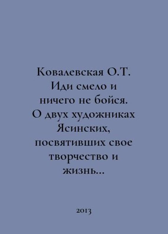 O.T. Kovalevskaya Go boldly and fear nothing. About two artists of Yasinskys who dedicated their creativity and life to art for children In Russian /Kovalevskaya O.T. Idi smelo i nichego ne boysya. O dvukh khudozhnikakh Yasinskikh, posvyativshikh svoe tvorchestvo i zhizn iskusstvu dlya detey St. Petersburg Russian Island 2013. You are welcome to reach out to us for a detailed description of the copies currently available. Delivery of this book may take longer than usual including extended processing and pre-shipping time, no expedited shipping is available. Please advise us if you have a set date or a deadline to receive your order.SKUalbb125d6ea87e09699