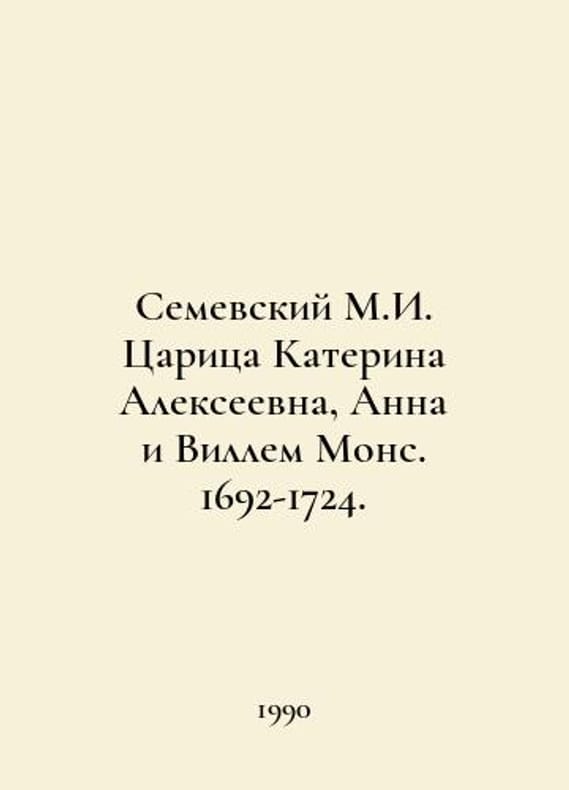 Semevsky M.I. Tsarina Katerina Alekseevna, Anna and Willem Mons. 1692-1724. In Russian /Semevskiy M.I. Tsaritsa Katerina Alekseevna, Anna i Villem Mons. 1692-1724. Essay from Russian history in the 18th century. Reprinting of the 1884 edition L Art Literature 1990. You are welcome to reach out to us for a detailed description of the copies currently available. Delivery of this book may take longer than usual including extended processing and pre-shipping time, no expedited shipping is available. Please advise us if you have a set date or a deadline to receive your order.SKUalbb45fd949b61feda0