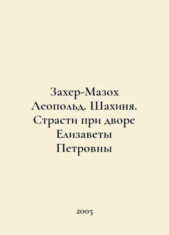 Zaher-Masokh Leopold. Shahina. Passion at the Court of Elizabeth Petrovna In Russian /Zakher-Mazokh Leopold. Shakhinya. Strasti pri dvore Elizavety Petrovny Series: The Intimate Life of the Monarchs of St. Petersburg. Institute of Soitology 2005. You are welcome to reach out to us for a detailed description of the copies currently available. Delivery of this book may take longer than usual including extended processing and pre-shipping time, no expedited shipping is available. Please advise us if you have a set date or a deadline to receive your order.SKUalbb78272582a4654bf