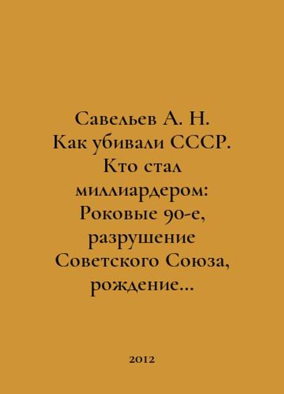 Savelyev A.N. How the USSR was assassinated. Who became a billionaire: The fateful 90 s, the collapse of the Soviet Union, the birth of oligarchy. In Russian /Savelev A. N. Kak ubivali SSSR. Kto stal milliarderom: Rokovye 90-e, razrushenie Sovetskogo Soyuza, rozhdenie oligarkhii. M. The Book World 2012. You are welcome to reach out to us for a detailed description of the copies currently available. Delivery of this book may take longer than usual including extended processing and pre-shipping time, no expedited shipping is available. Please advise us if you have a set date or a deadline to receive your order.SKUalbb919eebe536446ac