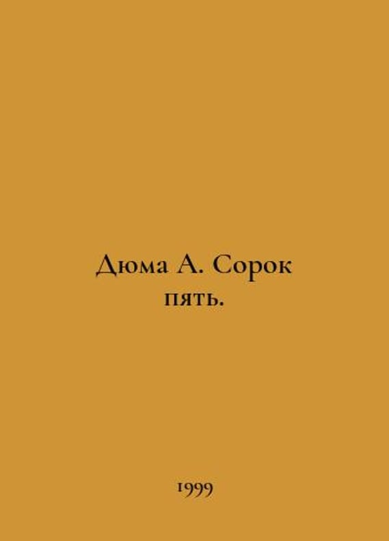 Dumas A. Forty-five. In Russian /Dyuma A. Sorok pyat. M. ACT Library of Adventure and Science Fiction 1999. You are welcome to reach out to us for a detailed description of the copies currently available. Delivery of this book may take longer than usual including extended processing and pre-shipping time, no expedited shipping is available. Please advise us if you have a set date or a deadline to receive your order.SKUalbbb31b4a66d67afb0