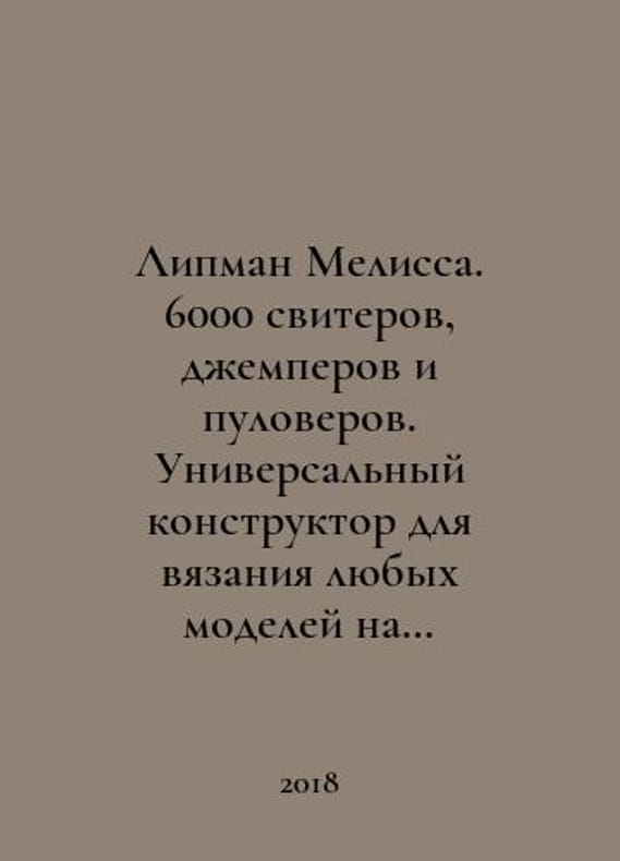 Melissa Lipman. 6000 sweaters, jumpers and pullovers. Universal designer for knitting any model to all sizes. In Russian /Lipman Melissa. 6000 sviterov, dzhemperov i puloverov. Universalnyy konstruktor dlya vyazaniya lyubykh modeley na vse razmery. Moscow Expo 2018..You are welcome to reach out to us for a detailed description of the copies currently available. Delivery of this book may take longer than usual including extended processing and pre-shipping time, no expedited shipping is available. Please advise us if you have a set date or a deadline to receive your order. SKUalbbd6cab7f377691cb