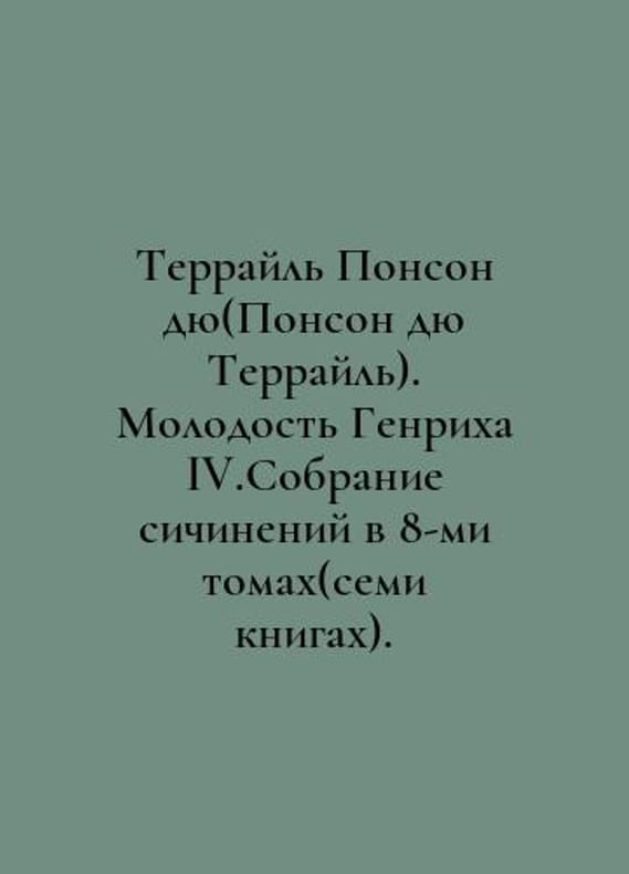 Terrail Ponson du (Ponson du Terrail). Henry IVs Youth. A collection of sitcoms in eight volumes (seven books). In Russian /Terrayl Ponson dyu(Ponson dyu Terrayl). Molodost Genrikha IV.Sobranie sichineniy v 8-mi tomakh(semi knigakh). M. RIPOL 1991-1994. You are welcome to reach out to us for a detailed description of the copies currently available. Delivery of this book may take longer than usual including extended processing and pre-shipping time, no expedited shipping is available. Please advise us if you have a set date or a deadline to receive your order.SKUalbbd7970a0842ef749
