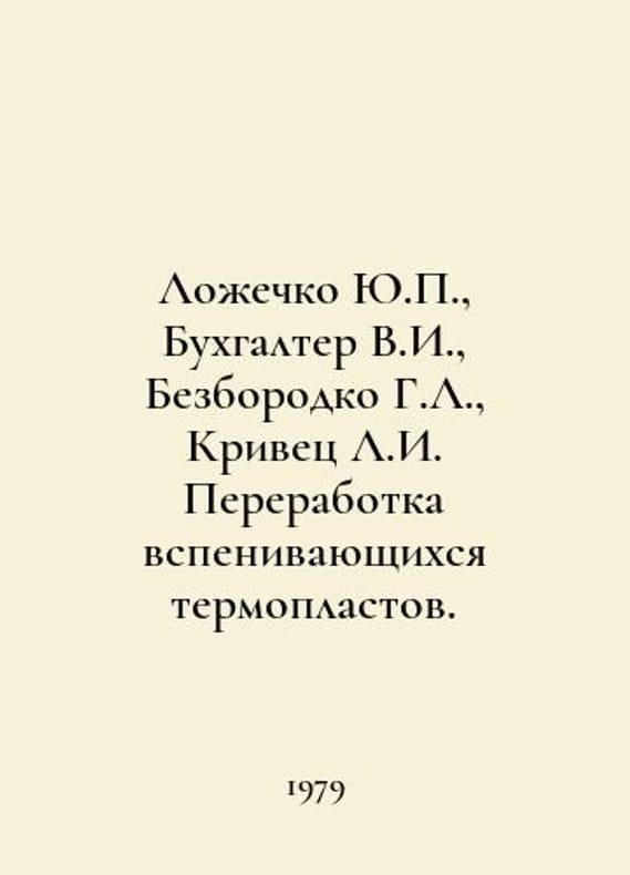 Spoon Y., Accountant V.I., Bezborodko G.L., Krivets L.I. Recycling of foaming thermoplastics. In Russian /Lozhechko Yu., Bukhgalter V.I., Bezborodko G.L., Krivets L.I. Pererabotka vspenivayushchikhsya termoplastov. The Polymer Recycling Workers Library Series, 1979..You are welcome to reach out to us for a detailed description of the copies currently available. Delivery of this book may take longer than usual including extended processing and pre-shipping time, no expedited shipping is available. Please advise us if you have a set date or a deadline to receive your order. SKUalbbeacb4130d48e53c
