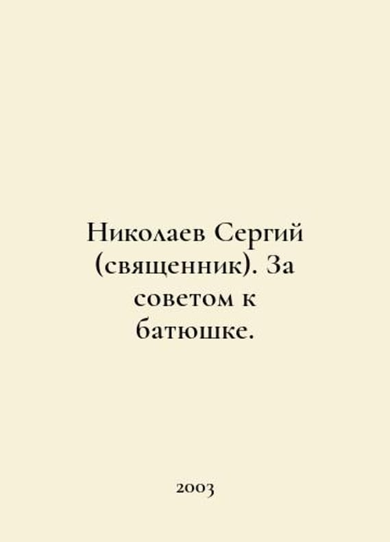 Nikolaev Sergiy (priest). For advice to the priest. In Russian /Nikolaev Sergiy (svyashchennik). Za sovetom k batyushke. M. Danilovsky evangelist. 2003..You are welcome to reach out to us for a detailed description of the copies currently available. Delivery of this book may take longer than usual including extended processing and pre-shipping time, no expedited shipping is available. Please advise us if you have a set date or a deadline to receive your order. SKUalbbfae331ceb06c6f8