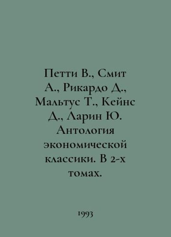 Petty W., Smith A., Ricardo D., Malthus T., Keynes D., Larin Yu. Anthology of Economic Classics. In two volumes. In Russian /Petti V., Smit A., Rikardo D., Maltus T., Keyns D., Larin Yu. Antologiya ekonomicheskoy klassiki. V 2-kh tomakh. Book 1-V. Petty-Treatise on Taxes and Fees, A. Smith-Study on the Nature and Causes of the Wealth of the People, D. Ricardo-The Beginning of Political Economy and Taxation. 2-T. Malthus-Experience on Population Law (not published during the Soviet period), La M. Ekonov. 1993.You are welcome to reach out to us for a detailed description of the copies currently available. SKUalbc0a8de80e4b62bc7.