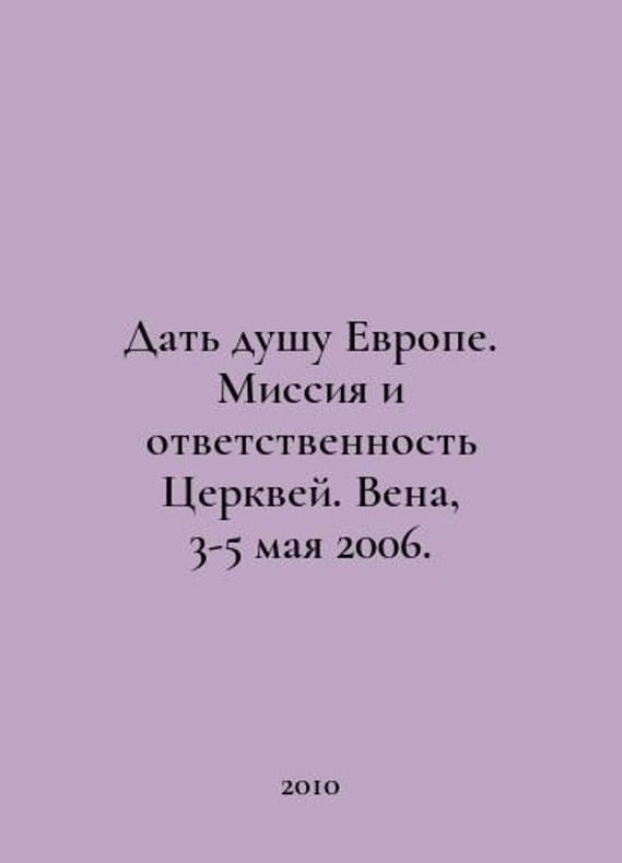 Giving the Soul of Europe. The Mission and Responsibility of Churches. Vienna, May 3-5, 2006. In Russian /Dat dushu Evrope. Missiya i otvetstvennost Tserkvey. Vena, 3-5 maya 2006. Compilation. Vienna. Pontifical Council for External Church Relations of the Moscow Patriarchate. 2010..You are welcome to reach out to us for a detailed description of the copies currently available. Delivery of this book may take longer than usual including extended processing and pre-shipping time, no expedited shipping is available. Please advise us if you have a set date or a deadline to receive your order. SKUalbc3760ef0ae13be2d