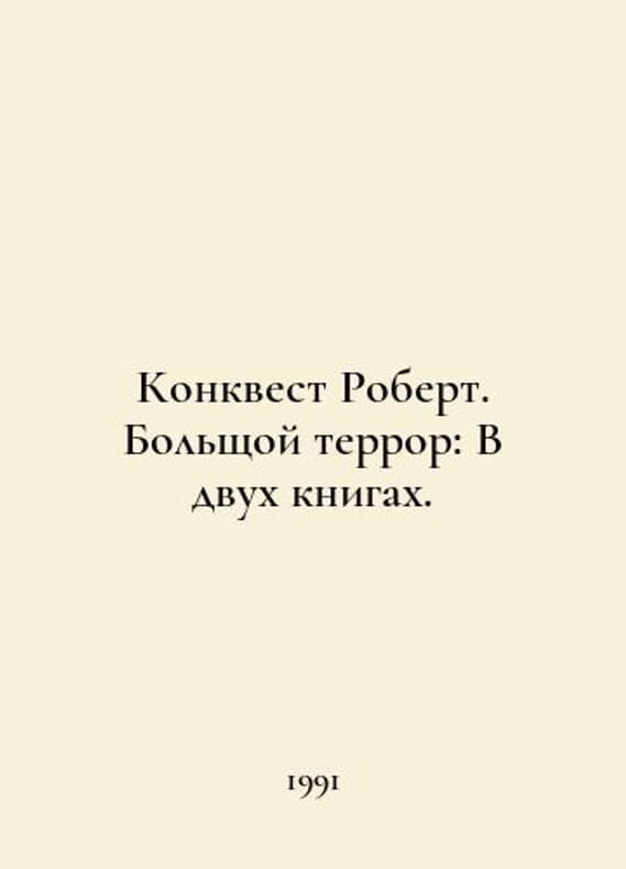 Conquest Robert: The Great Terror: In Two Books. In Russian /Konkvest Robert. Bolshchoy terror: V dvukh knigakh. Translation from English by L. Vladimirova. Riga Rakstnieks 1991. You are welcome to reach out to us for a detailed description of the copies currently available. Delivery of this book may take longer than usual including extended processing and pre-shipping time, no expedited shipping is available. Please advise us if you have a set date or a deadline to receive your order.SKUalbc56e1017bc903a57