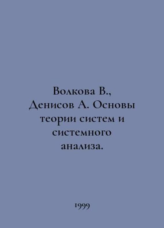 Volkova V., Denisov A. Fundamentals of Systems Theory and System Analysis. In Russian /Volkova V., Denisov A. Osnovy teorii sistem i sistemnogo analiza. Editions 2, revised and supplemented by SPB SPBSTU 1999. You are welcome to reach out to us for a detailed description of the copies currently available. SKUalbc59aecfff4879bee.