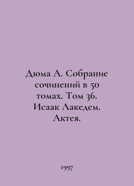 Dumas A. A collection of essays in 50 volumes. Volume 36. Isaac Lakedem. Actea. In Russian /Dyuma A. Sobranie sochineniy v 50 tomakh. Tom 36. Isaak Lakedem. Akteya. Illya Ganeshina. Moscow Art-Business Center 1997. You are welcome to reach out to us for a detailed description of the copies currently available. Delivery of this book may take longer than usual including extended processing and pre-shipping time, no expedited shipping is available. Please advise us if you have a set date or a deadline to receive your order.SKUalbc8d4e860dfad5856
