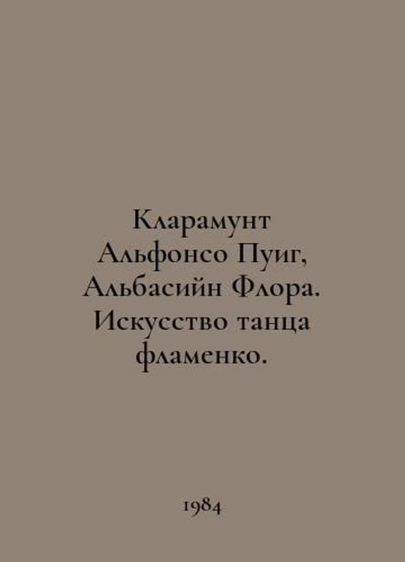 Claramunte Alfonso Puig, Albasin Flora. The Art of Flamenco Dance. In Russian /Klaramunt Alfonso Puig, Albasiyn Flora. Iskusstvo tantsa flamenko. M. Art. 1984. You are welcome to reach out to us for a detailed description of the copies currently available. SKUalbc8d66caf5825f44b.