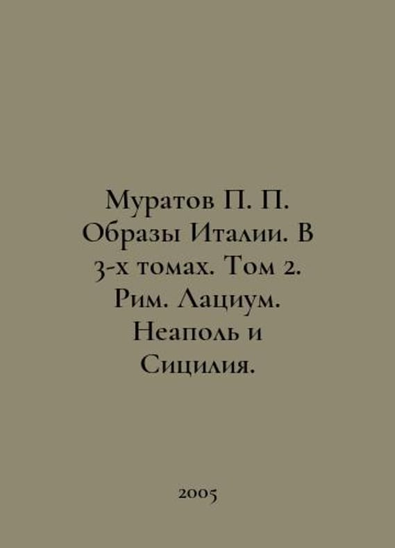 Muratov Images of Italy. In 3 volumes. Volume 2. Rome. Lazium. Naples and Sicily. In Russian /Muratov Obrazy Italii. V 3-kh tomakh. Tom 2. Rim. Latsium. Neapol i Sitsiliya. ABC 2005. You are welcome to reach out to us for a detailed description of the copies currently available. Delivery of this book may take longer than usual including extended processing and pre-shipping time, no expedited shipping is available. Please advise us if you have a set date or a deadline to receive your order.SKUalbcb3f4fadc241c98b