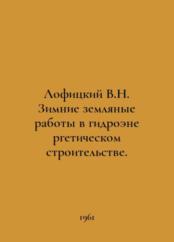 V.N. Lofitsky Winter earthworks in hydropower construction. In Russian /Lofitskiy V.N. Zimnie zemlyanye raboty v gidroenergeticheskom stroitelstve. Moscow. State Energy Publishing House 1961..You are welcome to reach out to us for a detailed description of the copies currently available. Delivery of this book may take longer than usual including extended processing and pre-shipping time, no expedited shipping is available. Please advise us if you have a set date or a deadline to receive your order. SKUalbccfa4065ce9860b8