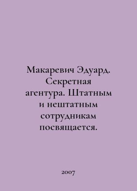 Makarevich Eduard. Secret Service. Staff and non-staff personnel are dedicated. In Russian /Makarevich Eduard. Sekretnaya agentura. Shtatnym i neshtatnym sotrudnikam posvyashchaetsya. The series: The Shield and the Sword by M. Algorithm. 2007. You are welcome to reach out to us for a detailed description of the copies currently available. Delivery of this book may take longer than usual including extended processing and pre-shipping time, no expedited shipping is available. Please advise us if you have a set date or a deadline to receive your order.SKUalbcde7b34481a5d278
