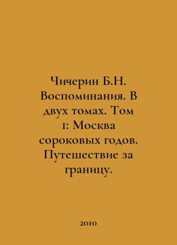 Chicherin B.N. Memoirs. In two volumes. Volume 1: Moscow of the Forties. Travel abroad. In Russian /Chicherin B.N. Vospominaniya. V dvukh tomakh. Tom 1: Moskva sorokovykh godov. Puteshestvie za granitsu. M. Sabashnikov Publishing House. 2010. You are welcome to reach out to us for a detailed description of the copies currently available. Delivery of this book may take longer than usual including extended processing and pre-shipping time, no expedited shipping is available. Please advise us if you have a set date or a deadline to receive your order.SKUalbcf882db2a96d9ef9