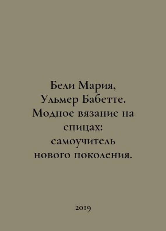 Beli Maria, Ulmer Babette. Fashionable knitting on spokes: a self-taught new generation. In Russian /Beli Mariya, Ulmer Babette. Modnoe vyazanie na spitsakh: samouchitel novogo pokoleniya. Translated from English by V.A. Vasilyeva. M. Eksmo. 2019..You are welcome to reach out to us for a detailed description of the copies currently available. Delivery of this book may take longer than usual including extended processing and pre-shipping time, no expedited shipping is available. Please advise us if you have a set date or a deadline to receive your order. SKUalbcffbac240dbbbb51