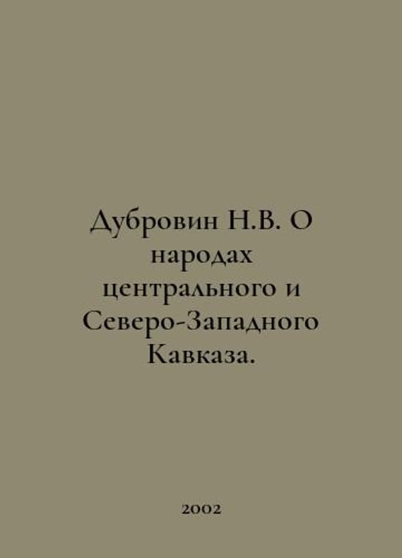 Dubrovin N.V. On the Peoples of the Central and North-Western Caucasus. In Russian /Dubrovin N.V. O narodakh tsentralnogo i Severo-Zapadnogo Kavkaza. CLIO series (Caucasian Literary and Historical Olympus). Nalchik. El Fa. 2002.You are welcome to reach out to us for a detailed description of the copies currently available. SKUalbd3b95bf5fd1db7e0.