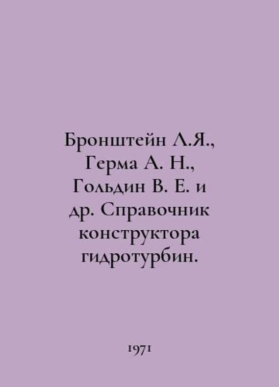 Bronshtein L.Ya., Germa A. N., Goldin V. E. et al. Reference book of the hydraulic turbine designer. In Russian /Bronshteyn L.Ya., Germa A. N., Goldin V. E. i dr. Spravochnik konstruktora gidroturbin. Edited by N. N. Kovalev. M. Machinostroenie 1971.You are welcome to reach out to us for a detailed description of the copies currently available. SKUalbd4eb19db2c009a6e.
