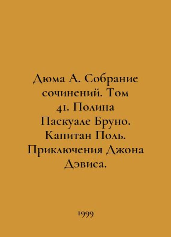 Dumas A. Collection of Works. Volume 41. Pauline Pasquale Bruno. Captain Paul. The Adventures of John Davies. In Russian /Dyuma A. Sobranie sochineniy. Tom 41. Polina Paskuale Bruno. Kapitan Pol. Priklyucheniya Dzhona Devisa. Translated from French by M. Art-Business-Center. 1999. You are welcome to reach out to us for a detailed description of the copies currently available. Delivery of this book may take longer than usual including extended processing and pre-shipping time, no expedited shipping is available. Please advise us if you have a set date or a deadline to receive your order.SKUalbd7e9dea83fe3ff56