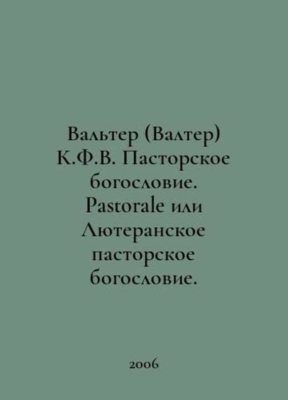 Walter C.F.W. Pastoral Theology. Pastorale or Lutheran Pastoral Theology. In Russian /Valter (Valter) K.F.V. Pastorskoe bogoslovie. Pastorale ili Lyuteranskoe pastorskoe bogoslovie. M. Lutheran Heritage. 2006..You are welcome to reach out to us for a detailed description of the copies currently available. Delivery of this book may take longer than usual including extended processing and pre-shipping time, no expedited shipping is available. Please advise us if you have a set date or a deadline to receive your order. SKUalbe3135bcb1110c3da