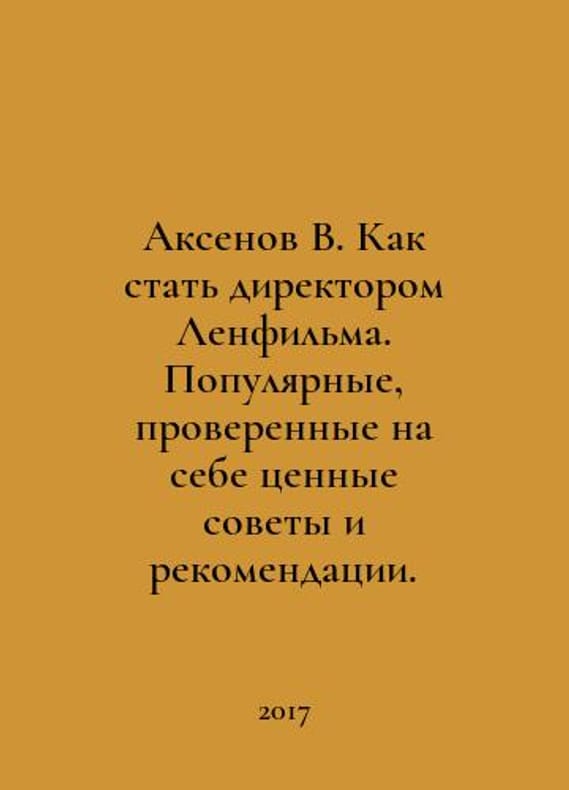 Aksenov V. How to become a director of Lenfilm. Popular, proven valuable advice and recommendations. In Russian /Aksenov V. Kak stat direktorom Lenfilma. Populyarnye, proverennye na sebe tsennye sovety i rekomendatsii. Petropolis St. Petersburg 2017. You are welcome to reach out to us for a detailed description of the copies currently available. SKUalbe38b97f186ef203e.