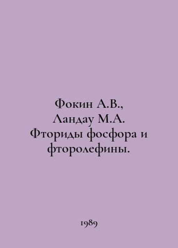 Fokin A.V., Landau M.A. Phosphorus fluoride and fluorolefins In Russian /Fokin A.V., Landau M.A. Ftoridy fosfora i ftorolefiny. Structure, nuclear magnetic resonance, reaction mechanisms M Science 1989..You are welcome to reach out to us for a detailed description of the copies currently available. Delivery of this book may take longer than usual including extended processing and pre-shipping time, no expedited shipping is available. Please advise us if you have a set date or a deadline to receive your order. SKUalbe4e777cddfd596ab