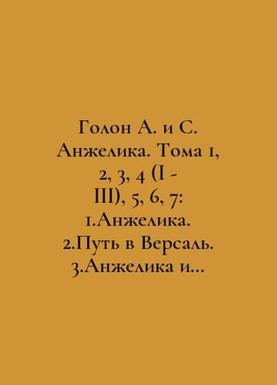 Golan A. and S. Angelica. Volumes 1, 2, 3, 4 (I-III), 5, 6, 7: 1.Angelica. 2. The Road to Versailles. 3. Angelica and the King. 4 (I-III). The Indomitable Angelica. 5. Angelica and Rescator. 6. Angelica in the New World. 7. Angelicas Temptation. 7 books. In Russian /Golon A. i S. Anzhelika. Toma 1, 2, 3, 4 (I - III), 5, 6, 7: 1.Anzhelika. 2.Put v Versal. 3.Anzhelika i Korol. 4 (I - III).Neukrotimaya Anzhelika. 5.Anzhelika i Reskator. 6.Anzhelika v Novom Svete. 7.Iskushenie Anzheliki. 7 knig. Riga. Sovaminko - Orion 1990 - 1993. You are welcome to reach out to us for a detailed description of the copies currently available. Delivery of this book may take longer than usual including extended processing and pre-shipping time, no expedited shipping is available. Please advise us if you have a set date or a deadline to receive your order.SKUalbe4efa2e066b233ee