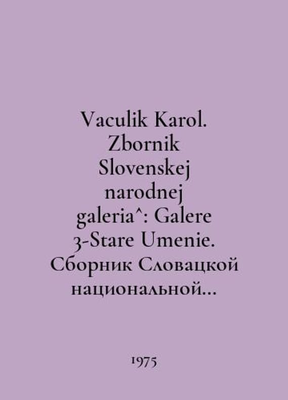 Vaculik Karol. Zbornik Slovenskej narodnej galeria : Galere 3-Stare Umenie. Collection of the Slovak National Gallery. Gallery 3. In Russian /Vaculik Karol. Zbornik Slovenskej narodnej galeria: Galere 3-Stare Umenie. Sbornik Slovatskoy natsionalnoy galerei. Galereya 3. Collection of articles in Slovak. Vedecky redaktor Vaculik Karol. Edited by Vaculik Karol. Bratislava Observer 1975. You are welcome to reach out to us for a detailed description of the copies currently available. SKUalbe4f595fa6ec757ba.