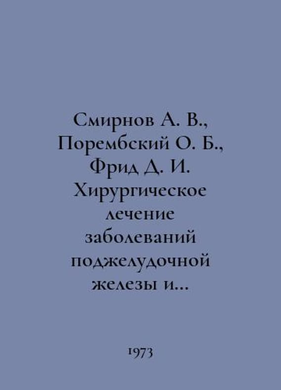 Smirnov A. V., Porembsky O. B., Frid D. I. Surgical treatment of pancreatic and periampulary diseases. In Russian /Smirnov A. V., Porembskiy O. B., Frid D. I. Khirurgicheskoe lechenie zabolevaniy podzheludochnoy zhelezy i periampulyarnoy oblasti. Edited by A. V. Smirnov. L. Medicine. 1973..You are welcome to reach out to us for a detailed description of the copies currently available. Delivery of this book may take longer than usual including extended processing and pre-shipping time, no expedited shipping is available. Please advise us if you have a set date or a deadline to receive your order. SKUalbe62f53324d522b09