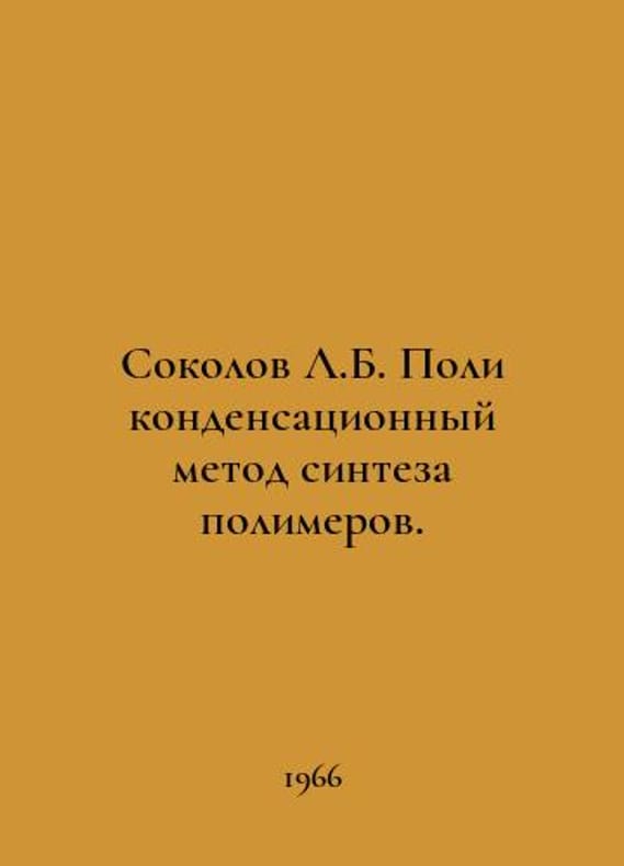 Sokolov L.B. Polycondensing method of polymer synthesis. In Russian /Sokolov L.B. Polikondensatsionnyy metod sinteza polimerov. M. Chemistry 1966..You are welcome to reach out to us for a detailed description of the copies currently available. Delivery of this book may take longer than usual including extended processing and pre-shipping time, no expedited shipping is available. Please advise us if you have a set date or a deadline to receive your order. SKUalbe88c3f4909ec233f
