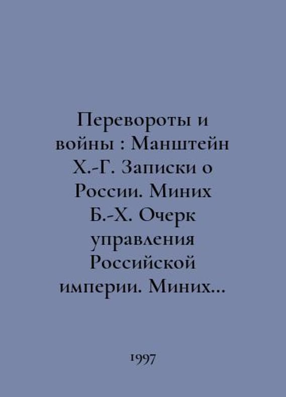 Coups and Wars: Manshtein H.-G. Notes on Russia. Minich B.-H. Essay on the Administration of the Russian Empire. Minich E. Notes. Unknown Author. Remarks on General Manshteins Notes on Russia. In Russian /Perevoroty i voyny: Manshteyn Kh.-G. Zapiski o Rossii. Minikh B.-Kh. Ocherk upravleniya Rossiyskoy imperii. Minikh E. Zapiski. Neizvestnyy avtor. Zamechaniya na Zapiski o Rossii generala Manshteyna. Series: History of Russia and the House of Romanov in the memoirs of contemporaries of the seventeenth-twentieth centuries. Compilation: Candidate of History A. Lieberman, Candidate of History V. Naumov. Postscript, indexes, glossary V. Naumov. Moscow. Sergei Dubov Foundation. 1997. You are welcome to reach out to us for a detailed description of the copies currently available. Delivery of this book may take longer than usual including extended processing and pre-shipping time, no expedited shipping is available. Please advise us if you have a set date or a deadline to receive your order.SKUalbe935ba515ba5ab7a