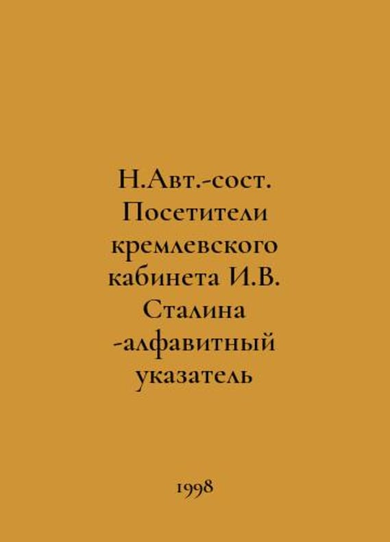 N.Avt.-composed Visitors to Stalins Kremlin Office - alphabetical index In Russian /N.Avt.-sost. Posetiteli kremlevskogo kabineta I.V. Stalina -alfavitnyy ukazatel Facial logs of the first secretary-general of 1924-1953 with brief characteristics and dates of life - historical archive # 4,1998. You are welcome to reach out to us for a detailed description of the copies currently available. Delivery of this book may take longer than usual including extended processing and pre-shipping time, no expedited shipping is available. Please advise us if you have a set date or a deadline to receive your order.SKUalbe93ec877a14dcf6a