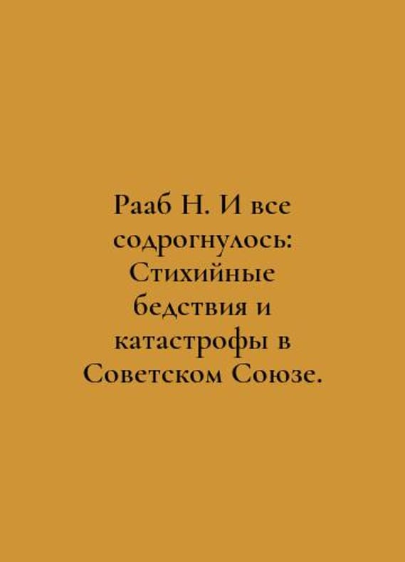 Raab N. And everything trembled: Natural disasters and catastrophes in the Soviet Union. In Russian /Raab N. I vse sodrognulos: Stikhiynye bedstviya i katastrofy v Sovetskom Soyuze. Series: Modern Western Russian Studies of St. Petersburg Academic Studies Press 2021. 384c. You are welcome to reach out to us for a detailed description of the copies currently available. Delivery of this book may take longer than usual including extended processing and pre-shipping time, no expedited shipping is available. Please advise us if you have a set date or a deadline to receive your order.SKUalbead3cf482f5e18d5