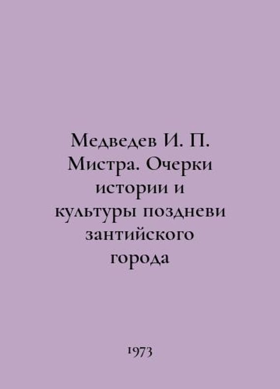 Medvedev I. Mistra. Essays on the History and Culture of a Late Byzantine City In Russian /Medvedev I. Mistra. Ocherki istorii i kultury pozdnevizantiyskogo goroda Science 1973. You are welcome to reach out to us for a detailed description of the copies currently available. Delivery of this book may take longer than usual including extended processing and pre-shipping time, no expedited shipping is available. Please advise us if you have a set date or a deadline to receive your order.SKUalbeb9ca85c02bf7c67