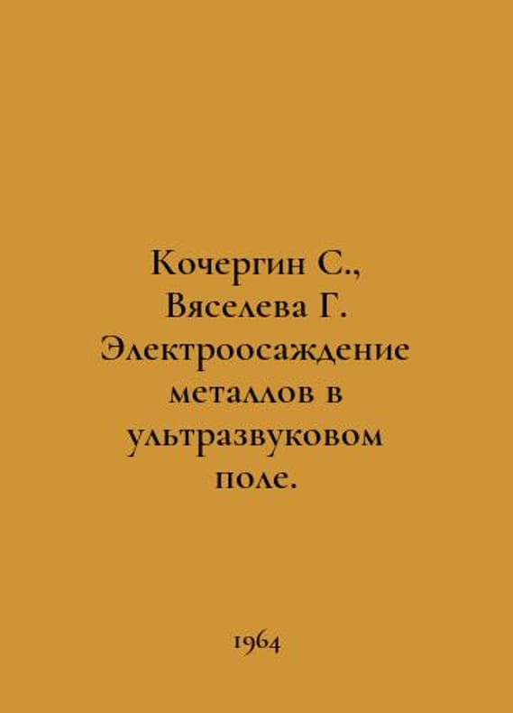 Kochergin S., Vyaseleva G. Electrodeposition of metals in ultrasound field. In Russian /Kochergin S., Vyaseleva G. Elektroosazhdenie metallov v ultrazvukovom pole. Textbook. M. Higher School 1964..You are welcome to reach out to us for a detailed description of the copies currently available. Delivery of this book may take longer than usual including extended processing and pre-shipping time, no expedited shipping is available. Please advise us if you have a set date or a deadline to receive your order. SKUalbec0b711a3e66d52a