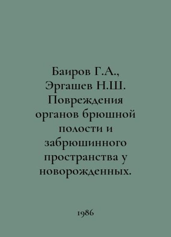 Bairov G.A., Ergashev N.Sh. Injuries to the abdominal cavity and peritoneal space in newborns. In Russian /Bairov G.A., Ergashev N.Sh. Povrezhdeniya organov bryushnoy polosti i zabryushinnogo prostranstva u novorozhdennykh. Tashkent Medicine of Uzbek SSR. 1986..You are welcome to reach out to us for a detailed description of the copies currently available. Delivery of this book may take longer than usual including extended processing and pre-shipping time, no expedited shipping is available. Please advise us if you have a set date or a deadline to receive your order. SKUalbec0f1692dbc58370