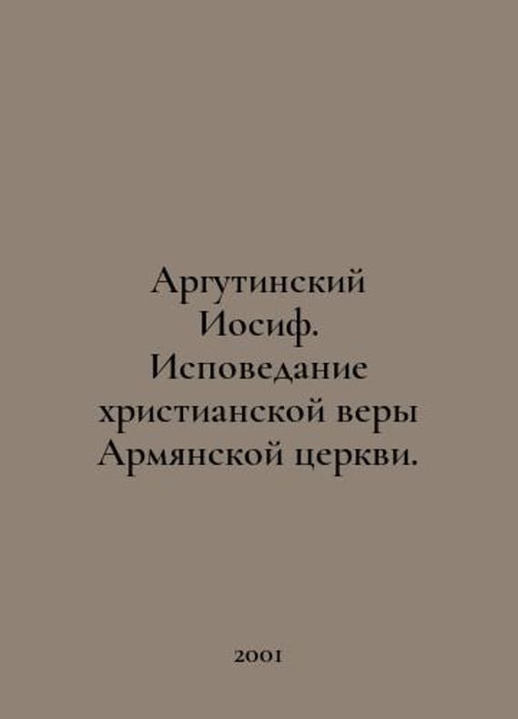 Joseph Argutinsky. Confession of the Christian Faith of the Armenian Church. In Russian /Argutinskiy Iosif. Ispovedanie khristianskoy very Armyanskoy tserkvi. Rostov-on-Don Molot 2001..You are welcome to reach out to us for a detailed description of the copies currently available. Delivery of this book may take longer than usual including extended processing and pre-shipping time, no expedited shipping is available. Please advise us if you have a set date or a deadline to receive your order. SKUalbecd4f1dcf6d5879c