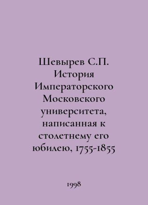 Shevyrev S. History of Imperial Moscow University, written to mark its centennial, 1755-1855 In Russian /Shevyrev S. Istoriya Imperatorskogo Moskovskogo universiteta, napisannaya k stoletnemu ego yubileyu, 1755-1855 Reprinting of the 1855 edition. Index of names to the History of Moscow State University Publishing House 1998. You are welcome to reach out to us for a detailed description of the copies currently available. Delivery of this book may take longer than usual including extended processing and pre-shipping time, no expedited shipping is available. Please advise us if you have a set date or a deadline to receive your order.SKUalbedda331b2ae6faa3