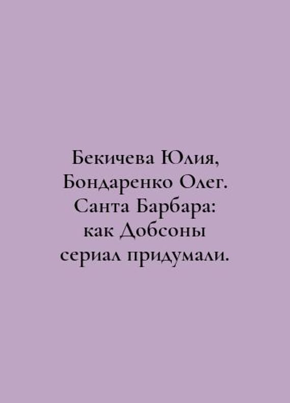 Bekitcheva Yulia, Bondarenko Oleg. Santa Barbara: how the Dobsons invented the series. In Russian /Bekicheva Yuliya, Bondarenko Oleg. Santa Barbara: kak Dobsony serial pridumali. M. Griphon 2022 232s. You are welcome to reach out to us for a detailed description of the copies currently available. SKUalbf0e2d1351c445aeb.