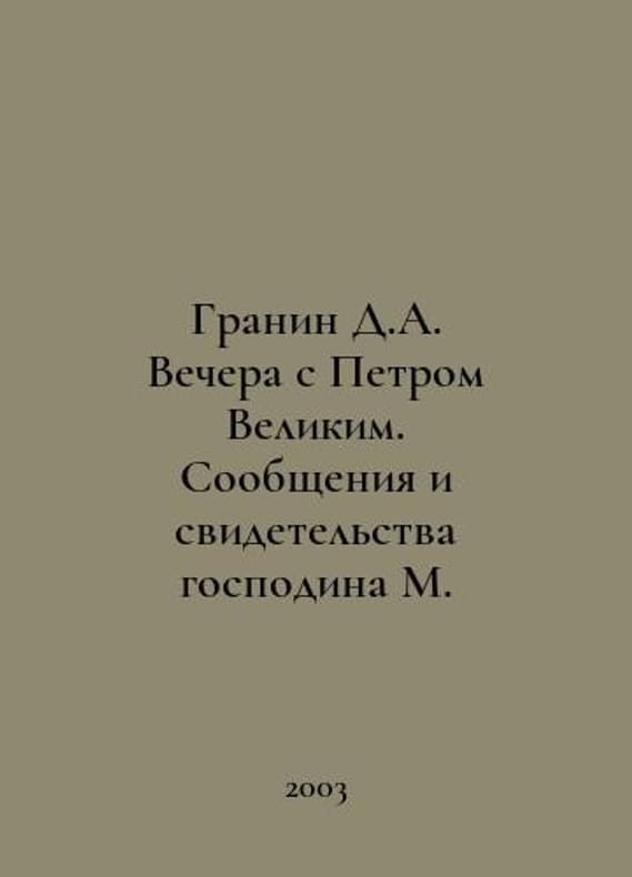 Granin D. Evening with Peter the Great (Messages and Testimonies of Mr. M). In Russian /Granin D. Vechera s Petrom Velikim ( Soobshcheniya i svidetelstva gospodina M ). St. Petersburg Historical Illustration 2000. You are welcome to reach out to us for a detailed description of the copies currently available. Delivery of this book may take longer than usual including extended processing and pre-shipping time, no expedited shipping is available. Please advise us if you have a set date or a deadline to receive your order.SKUalbcc3cb3c22206ee75