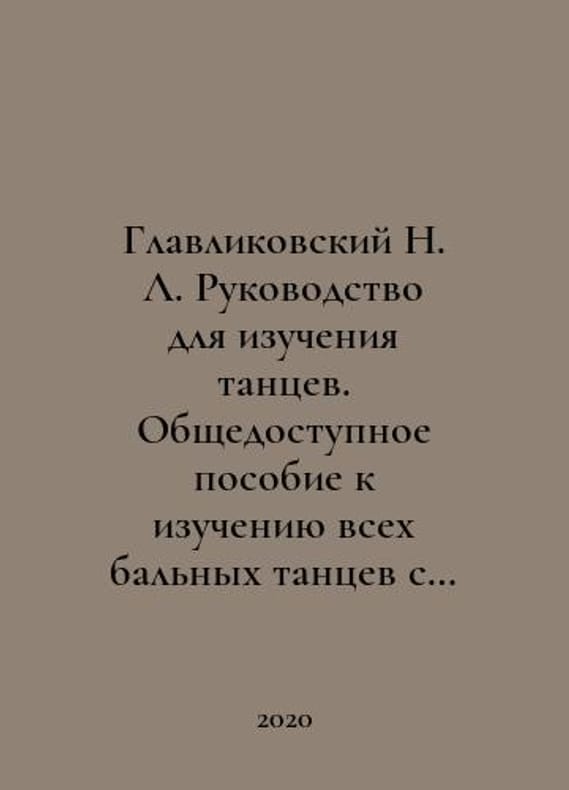N. L. Glavlikovskys Guide to the Study of Dance. A publicly available guide to the study of all ballroom dances with a figure guide for cotillion and mazurka. In Russian /Glavlikovskiy N. L. Rukovodstvo dlya izucheniya tantsev. Obshchedostupnoe posobie k izucheniyu vsekh balnykh tantsev s ukazatelem figur dlya kotilona i mazurki. Moscow Publishing House V. Sekachev 2020. You are welcome to reach out to us for a detailed description of the copies currently available. Delivery of this book may take longer than usual including extended processing and pre-shipping time, no expedited shipping is available. Please advise us if you have a set date or a deadline to receive your order.SKUalbf1b41b2f4b32184b